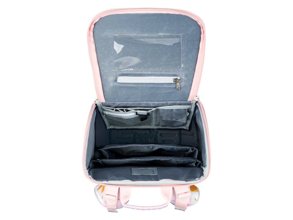• Vo vnútri aktovky je priehľadná kapsička na rozvrh a vnútorný organizér umožňujúci rovnomerné rozloženie hmotnosti, doplnený gumičkou na fixáciu.