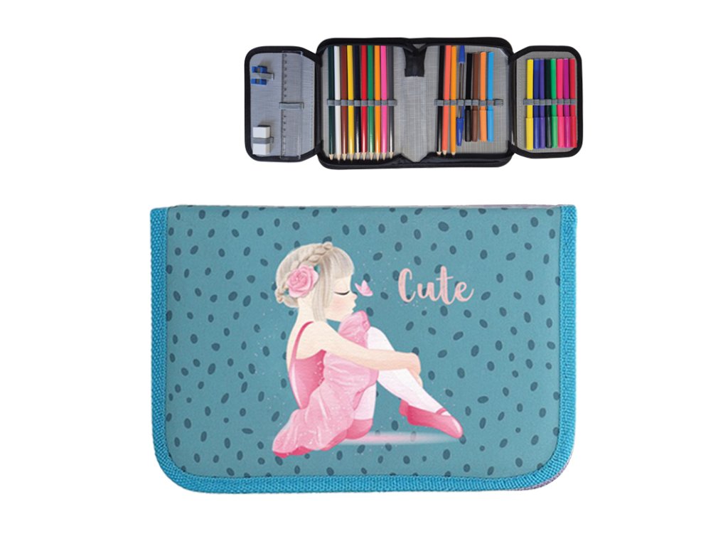 1poschodový peračník s výbavou. Obsahuje: pastelky-12 farieb, fixky -12farieb, grafitová ceruzka HB, pero, guma, strúhadlo, pravítko.