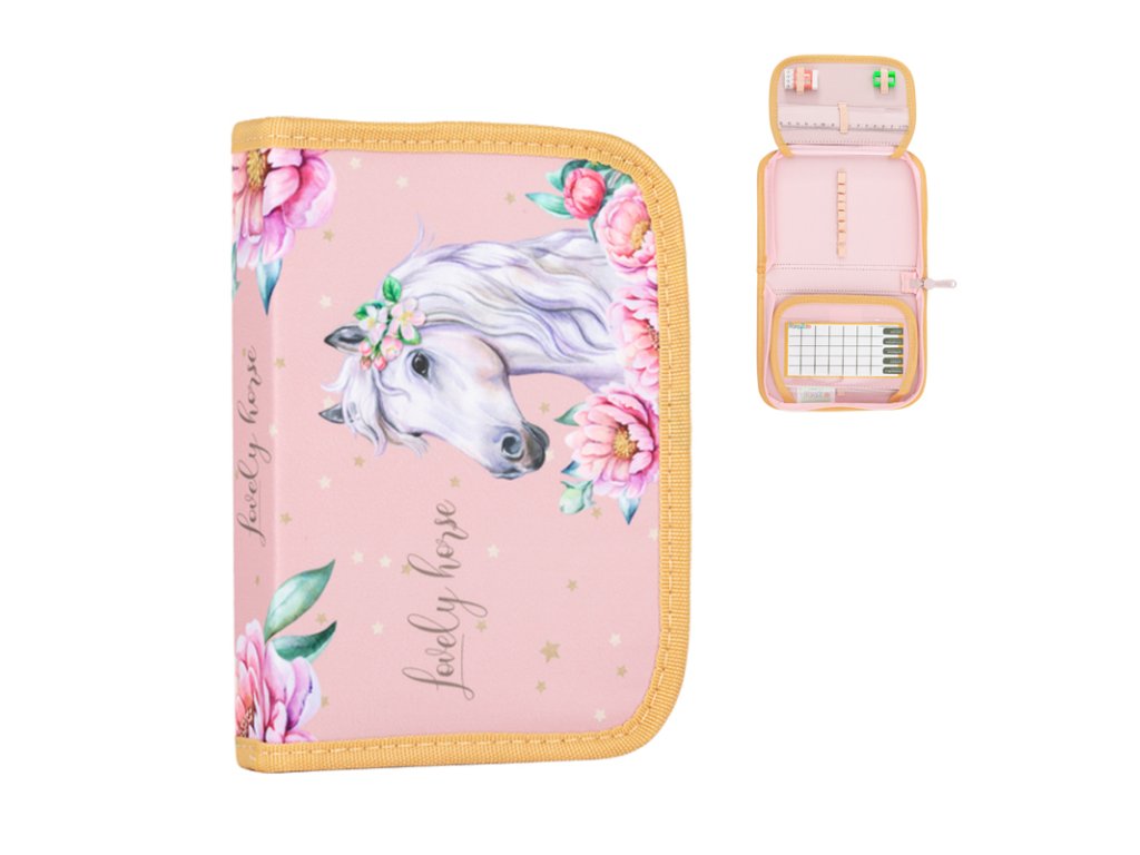 Detský školský jednoposchodový peračník s dvomi klopami, s 25 gumovými úchytmi na ceruzky a perá, gumu a prepážkou s priehľadnou fóliou a rozvrhom hodín. V peračníku je pravítko 15cm + guma + struhatko.