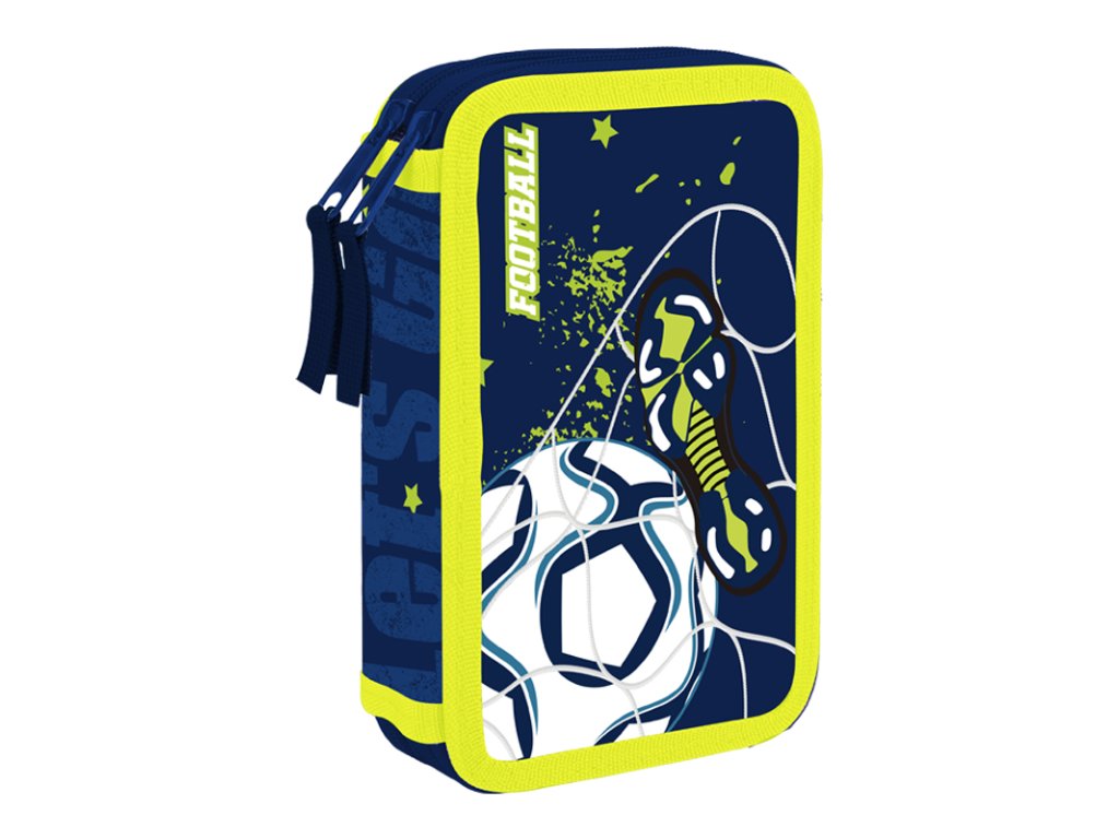 Školský dvojposchodový peračník futbal s gumovými úchytmi na ceruzky a perá, gumu a prepážkou s priehľadnou fóliou a rozvrhom hodín.. Peračník je prázdny.Rozmery: 21x13x4 cm